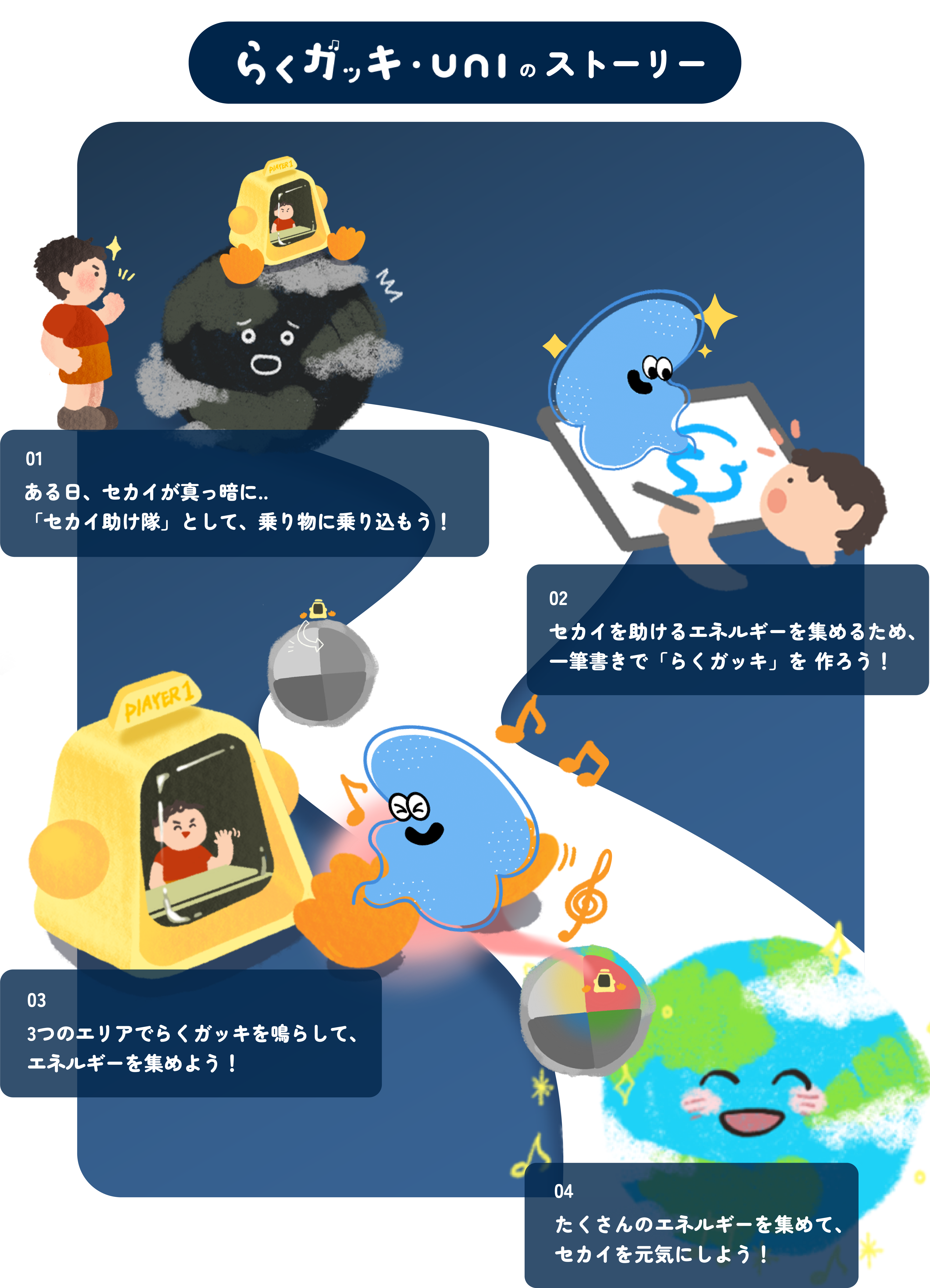 自分で作り出した「らくガッキ」と協力しながら世界を救う体験をすることで、「らくガッキ」への親しみを持ち、音色もさらに楽しめる設計としました。