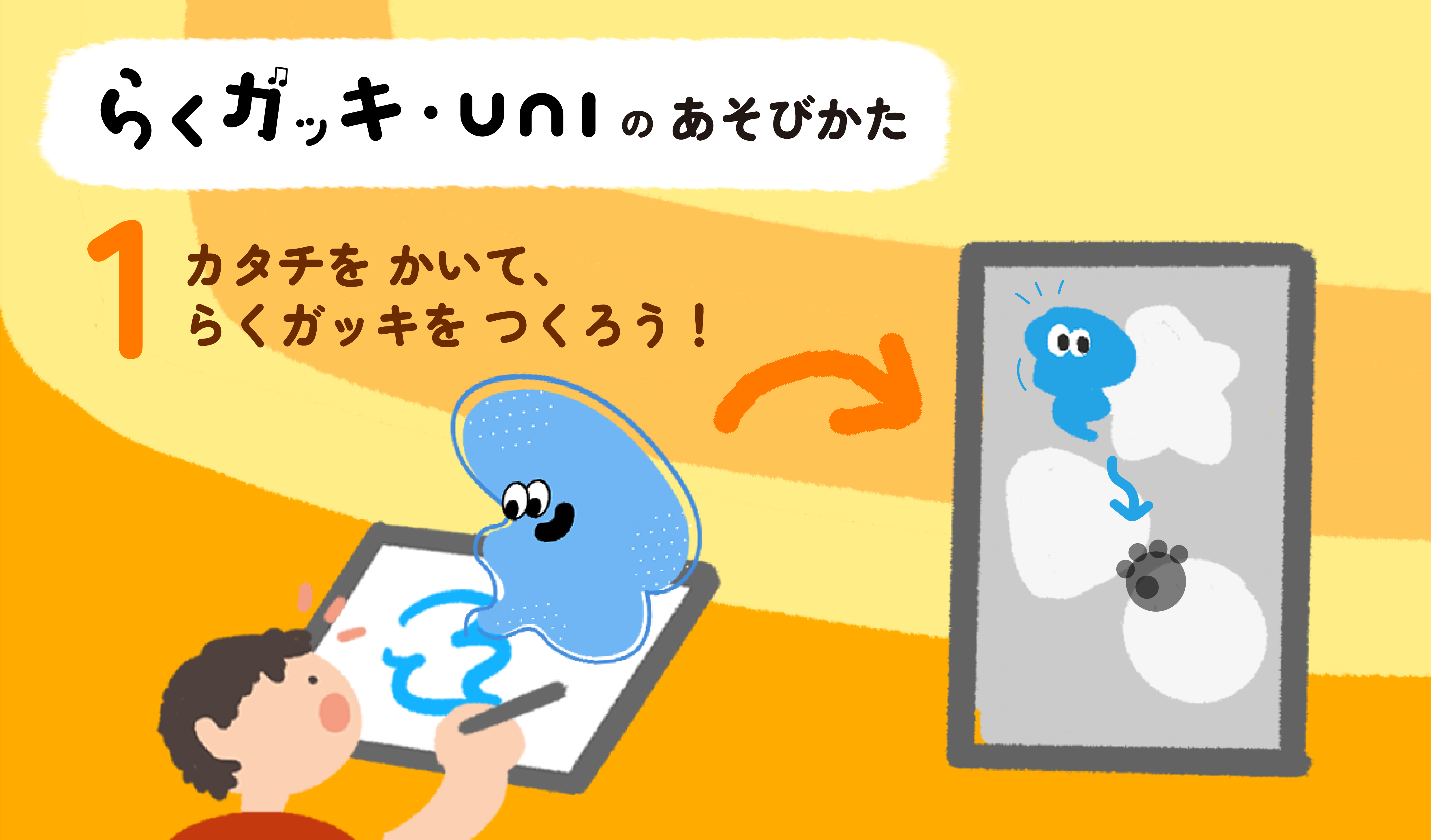 「らくガッキ・ユニ」は、自由に描いた絵が、音色と顔をつけた自分だけの"楽器"「らくガッキ」に変わり、スクリーン上の「らくガッキ」に手を振ることで音を鳴らして楽しめるインタラクティブなプロトタイプです。